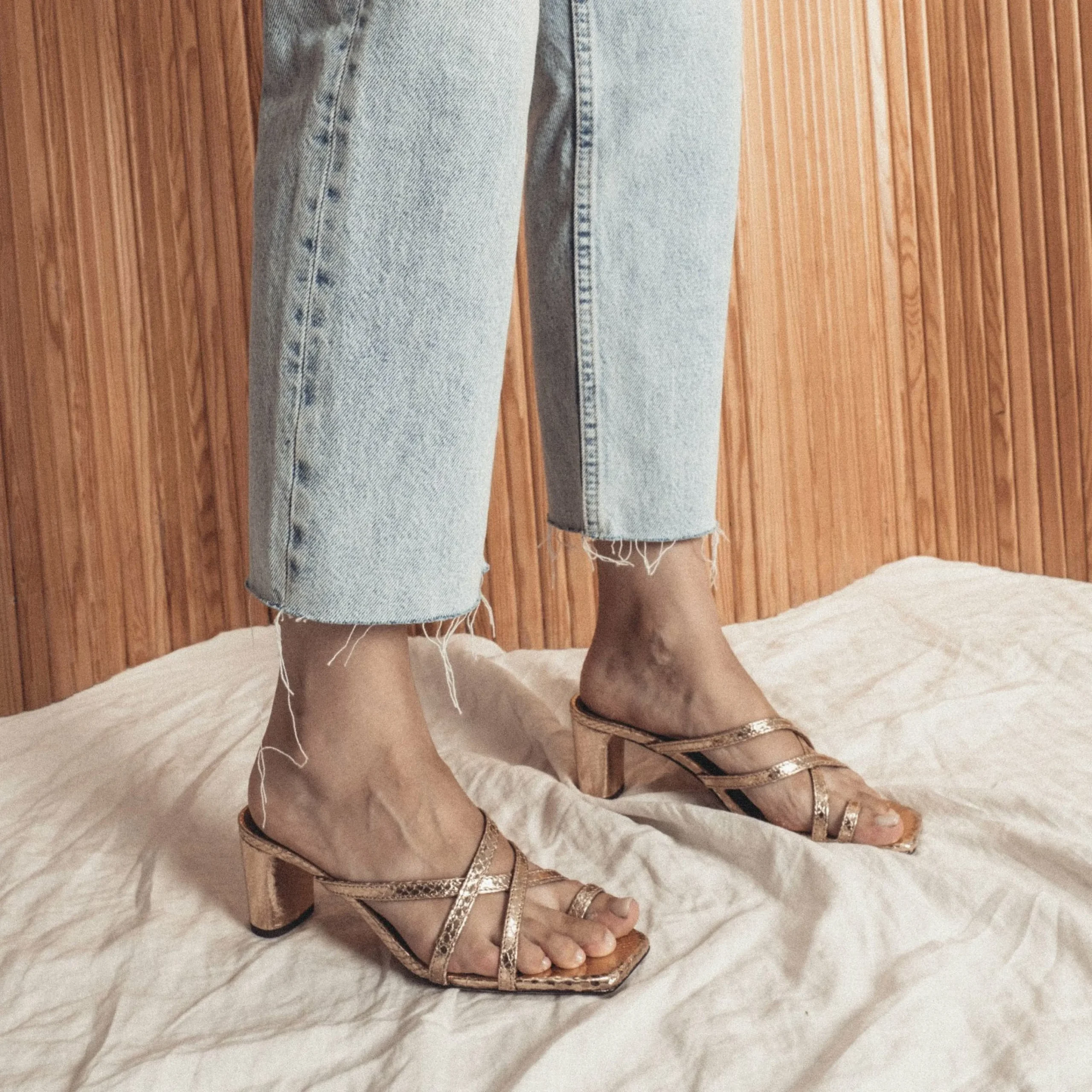 Upper: Snake metallic calf. More information about the material.
